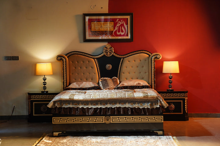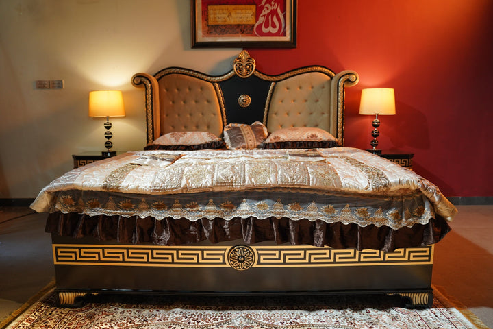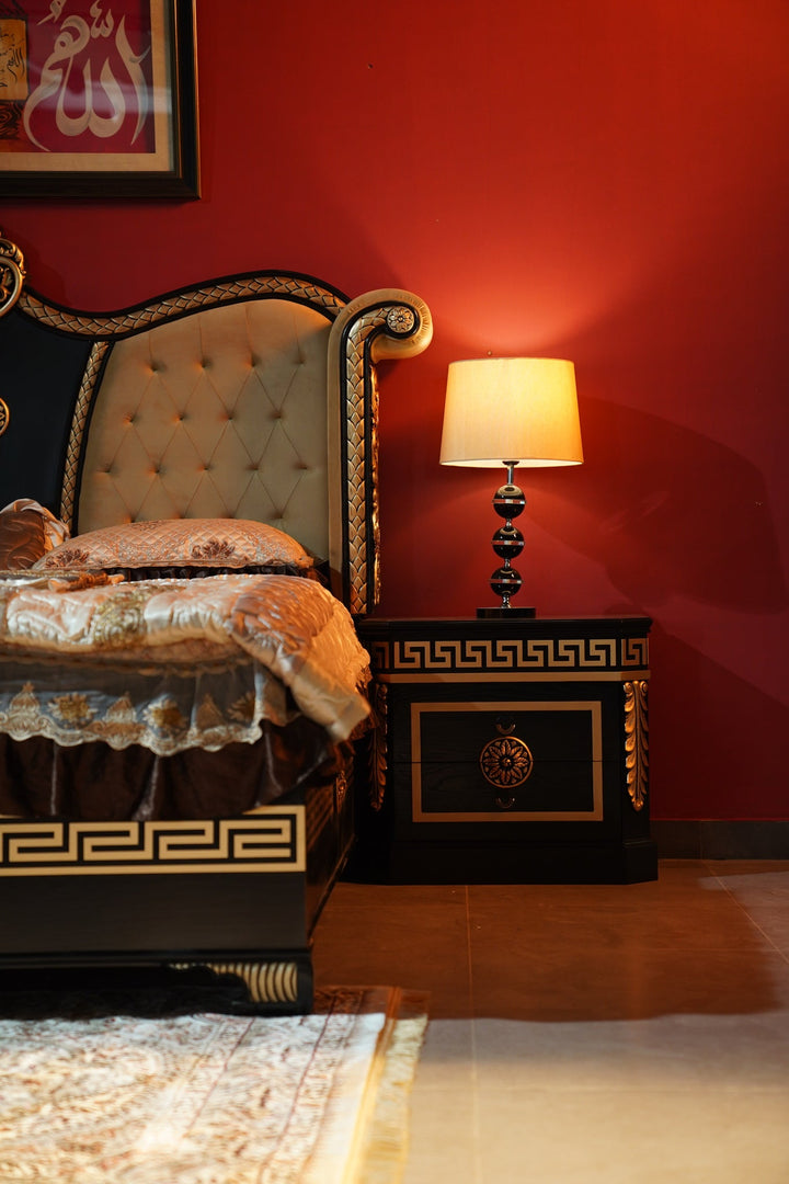 Introducing the ultimate statement piece for your bedroom - the stunning Versace Signature Bedroom Set. Expertly crafted using a unique combination of solid wood and veneer board, this set features a sophisticated matte black finish that exudes elegance and style. The Signature Versace design is showcased throughout, boasting intricate details and striking accents that will instantly elevate the look of any bedroom. Whether you're looking for a modern update to your current decor or want to create a bold new look, this bedroom set is the perfect choice. Don't settle for anything less than the best - choose the Versace Signature Bedroom Set and experience the ultimate in luxury and style.