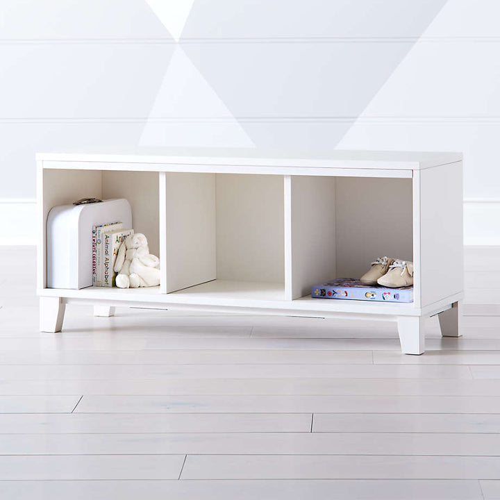 The open, airy design highlights the creamy ash veneer and provides plenty of space for favorite bedtime books, treasured keepsakes, bins of beloved stuffed animals and that perfect acorn they just had to bring home.