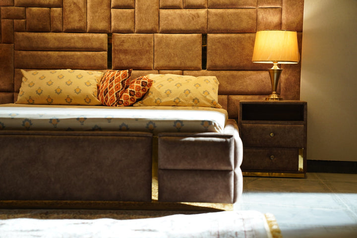 Introducing our stunning full cushioned bedroom set with a 10 feet by 10 feet backwall, the ultimate addition to your contemporary home! Crafted with superior quality materials and designed to offer both style and comfort, this set is the perfect blend of sophistication and functionality.