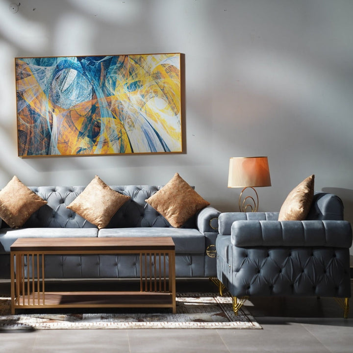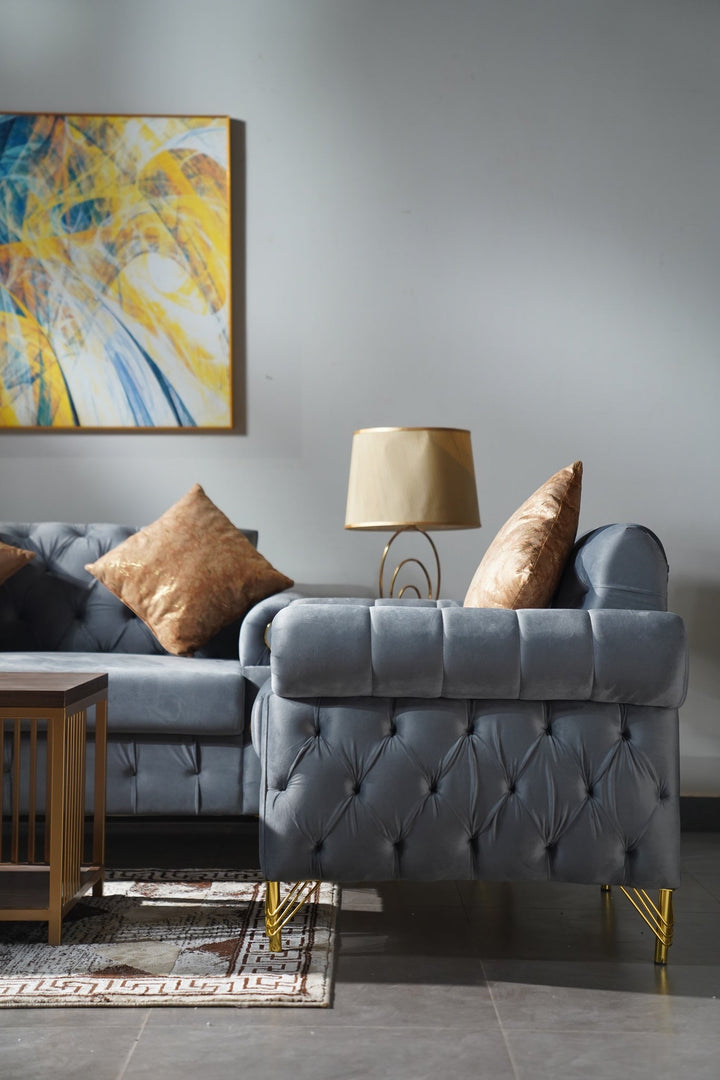 The sofa is upholstered in premium fabric, adding a touch of elegance to your home decor. The deep button tufting on the backrest and arms create a classic look, while the clean lines and minimalist design give it a modern touch.