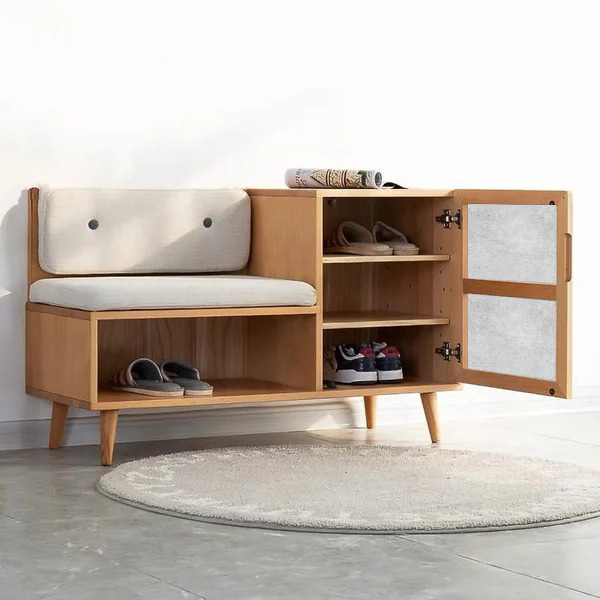 To further enhance its functionality, the shoe rack also includes a cabinet, offering concealed storage for accessories, shoe care items, or other belongings. Upgrade your entryway or bedroom with our Shoe Rack with Seating Space and Cabinet, combining convenience, style, and storage in one elegant package.