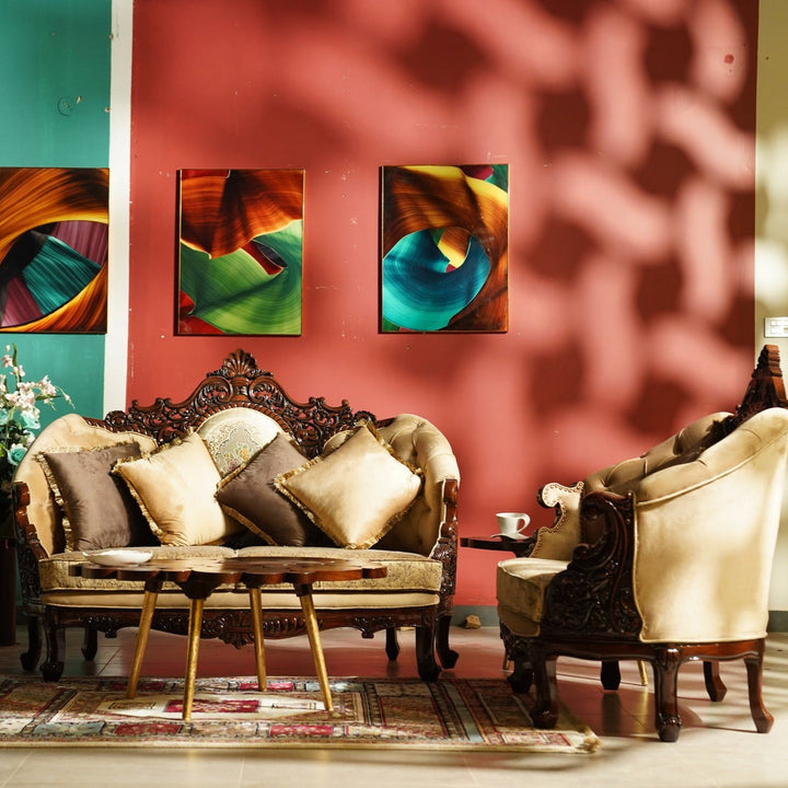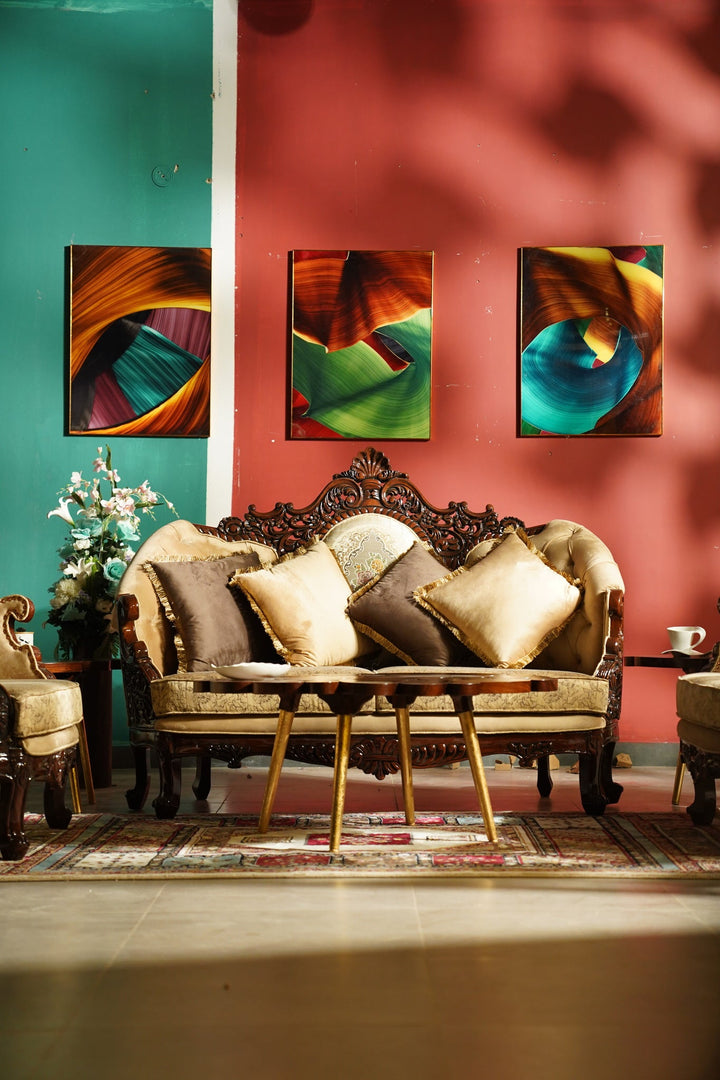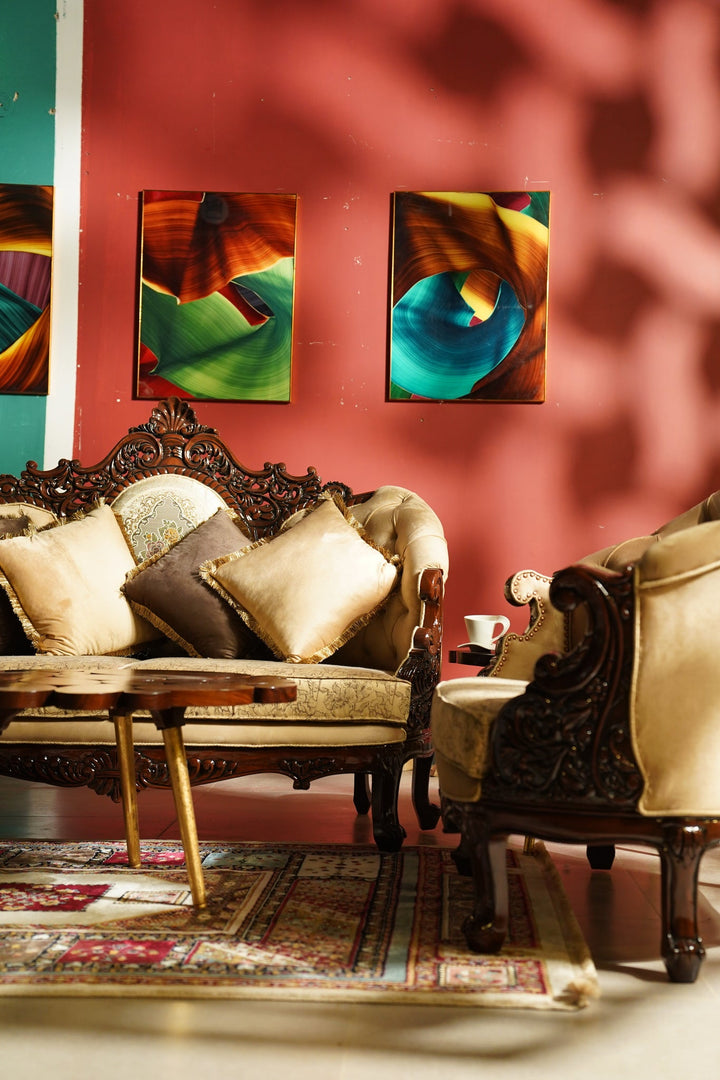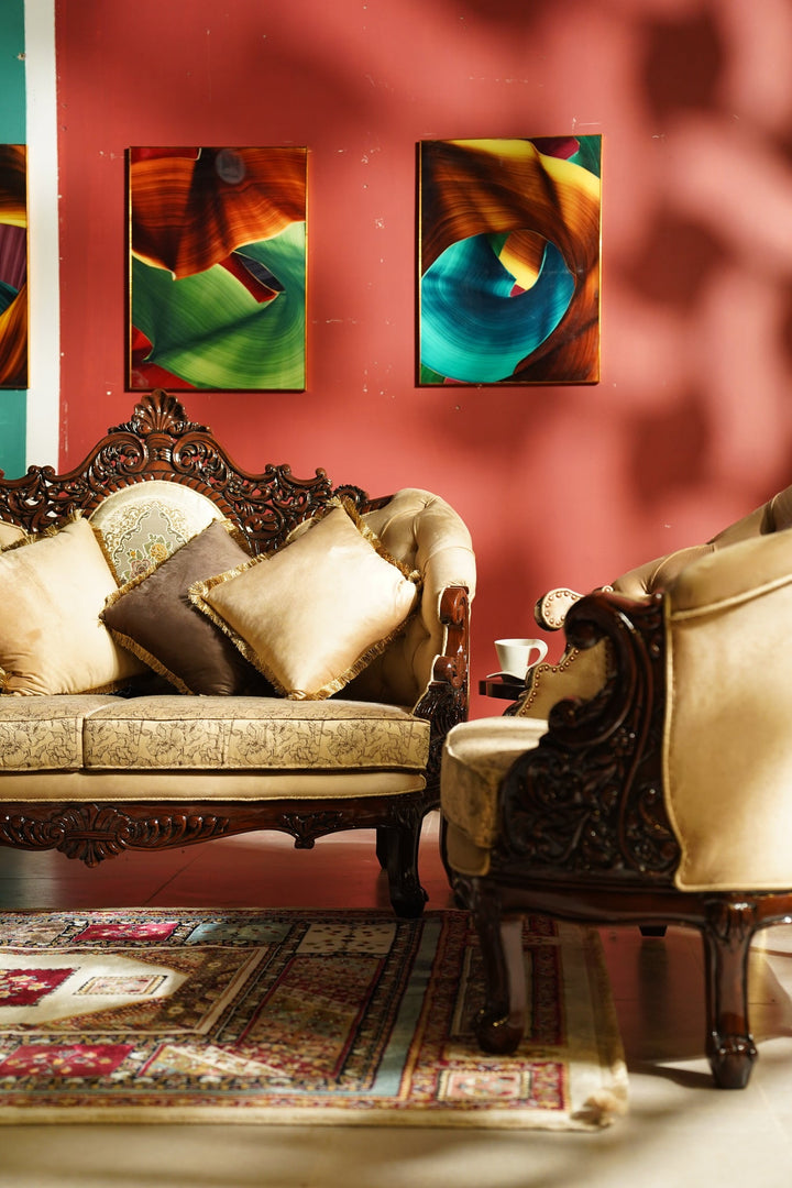 The sturdy and robust wooden frame provides unparalleled durability and ensures that this majestic sofa will grace your home for generations to come. Every inch of this masterpiece has been painstakingly carved with intricate patterns, giving it an air of grandeur and majesty.