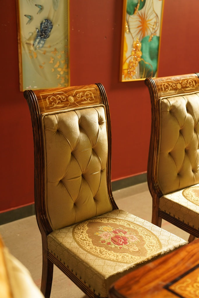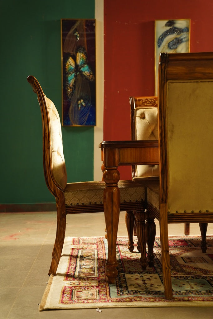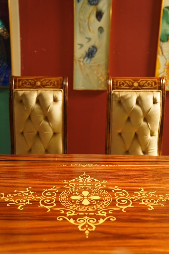 The table top is generously sized, providing ample space for family dinners, entertaining guests, or working from home. The table is also upholstered in imported fabric, which adds a luxurious touch and enhances the comfort of the dining experience.