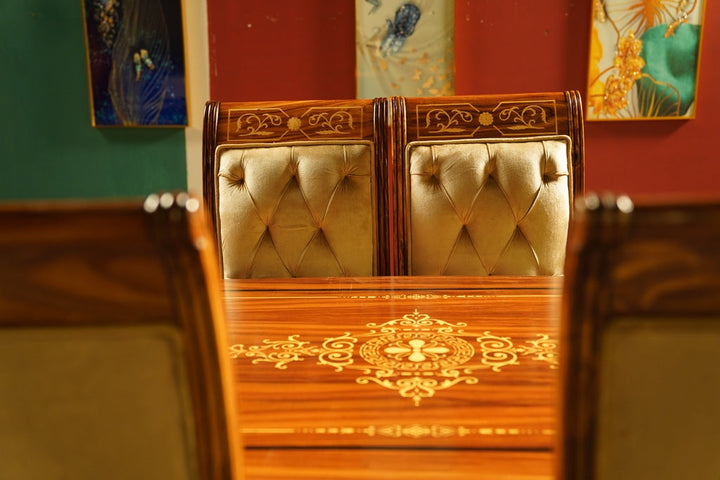 This elegant dining table is crafted from high-quality Indian rosewood, known for its durability and stunning grain patterns. The warm, rich tones of the wood are complemented by the table's sleek, contemporary design, which features clean lines and a minimalist aesthetic.