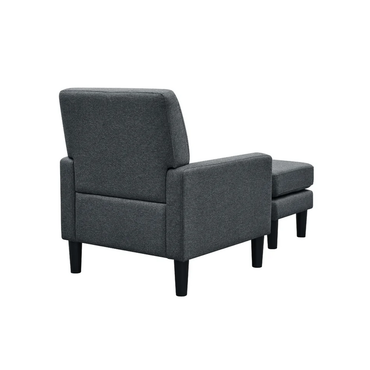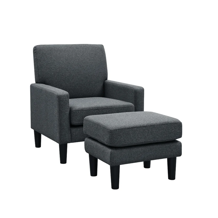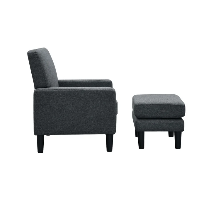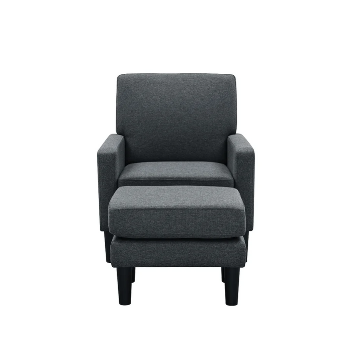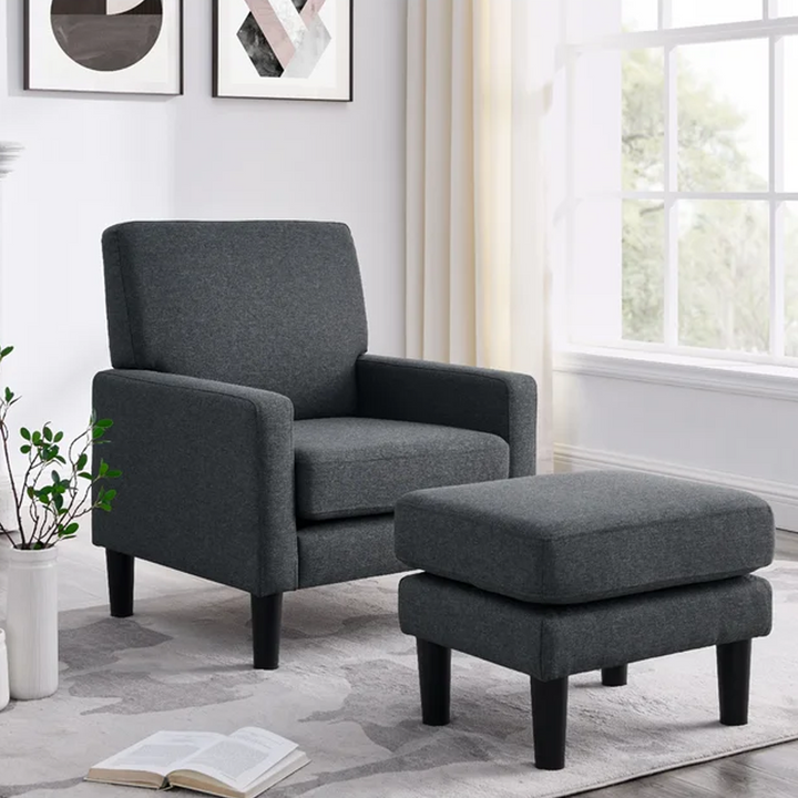 This armchair and ottoman set creates an ideal reading nook with a sleek, modern look. The chair is crafted with a kiln-dried engineered wood frame that sits on resin cylindrical legs with a dark finish.